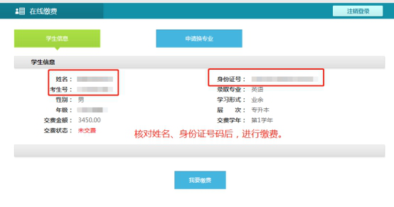 新生登录注册系统后,点:“我要缴费”,即可进入缴费页面,当前使用支付宝缴费(缴费前,核对个人信息即可,本人就读的教学点和专业可后面确认修改,祥见附件3)。