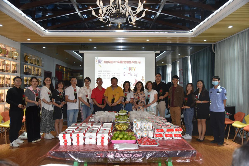 最后大家一起为2021年第四季度的寿星们庆生。此次生日会寿星人数为历史之最,共包含学院安保人员在内的15位同事。当《生日快乐》歌声响起,寿星们在李世云的介绍下一一走到会场中央,学院领导为各位寿星送上生日祝福并给他们献花。接着,所有寿星围着生日蛋糕点燃蜡烛,许下生日愿望,生日会圆满落幕。