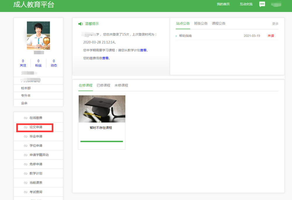 1. 登陆成教平台(用户:完整学号,密码:18位身份证号码)