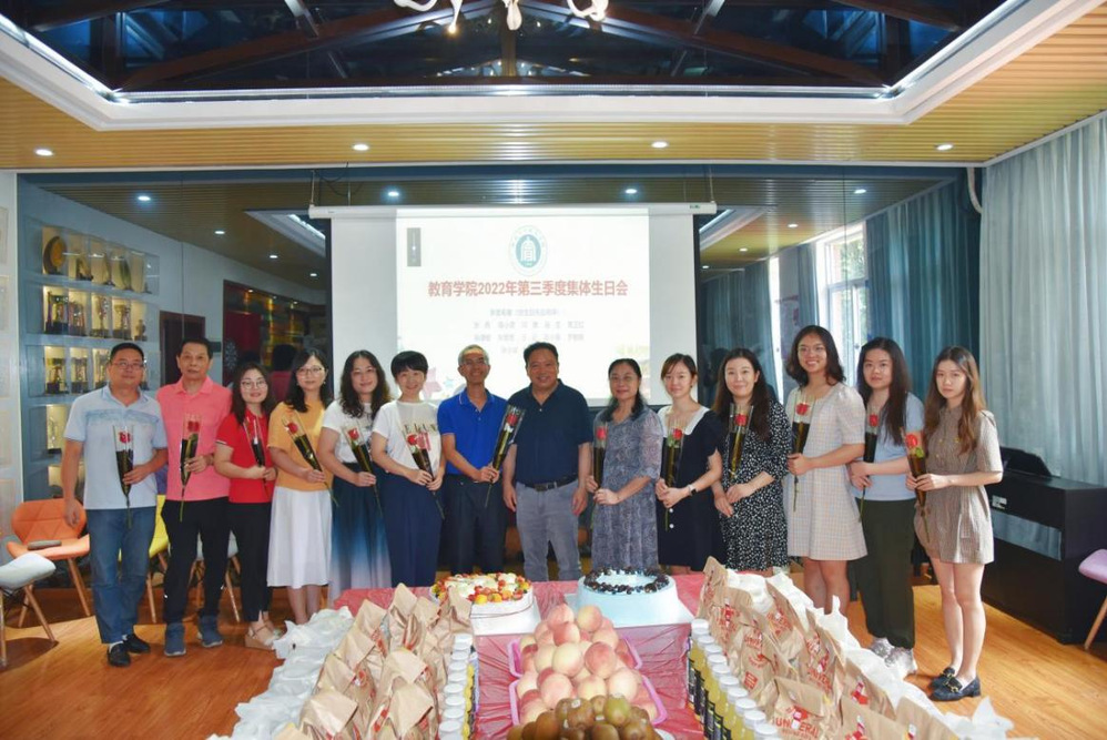 最后,大家一起为2022年第三季度的寿星们庆生,12位寿星在李世云的介绍下依次步入会场中间,伴随着熟悉的生日歌旋律,学院领导为各位寿星送上生日祝福并向他们一一献花,寿星们一起许愿、吹蜡烛、切蛋糕,生日会在幸福温馨的氛围中落下帷幕。