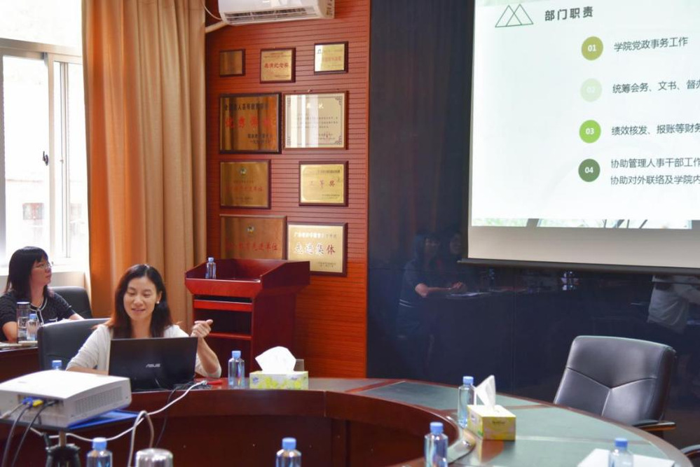 接着,开展了业务培训。此次培训由学院办公室主讲。院办主任周乐平、副主任兼院务秘书王荣桂、行政秘书汪云围绕办公室日常工作,分别介绍了部门职责、岗位设置,重点介绍了各自的岗位职责以及相关工作的流程,让大家对办公室业务有了全面深入的了解。