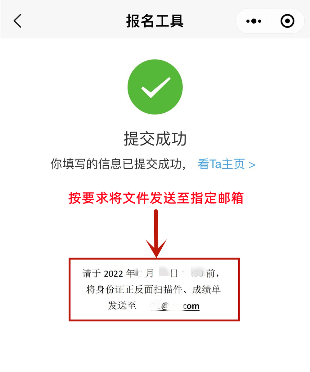 2、预报名成功后,于2022年10月10日23:00前,根据报名成功页面的指引(如图,截图保存),将“广东省高等教育自学考试成绩单”、“身份证正反面扫描件”、“附件2:个人信息采集表(需填写)”发送至指定邮箱,逾期未发送视为放弃本次报考。请自行提前登录广东省自学考试管理系统打印成绩单,打印方式详见附件3。