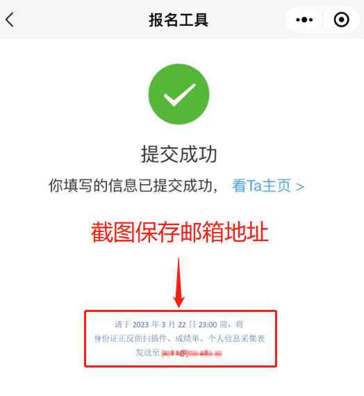 2、预报名成功后,于2023年3月22日23:00前,根据报名成功页面的指引(如图,截图保存),将“广东省高等教育自学考试成绩单”、“身份证正反面扫描件”、“附件:个人信息采集表(需填写)”发送至指定邮箱,逾期未发送视为放弃本次报考。请自行提前登录广东省自学考试管理系统打印成绩单,打印方式详见附件。