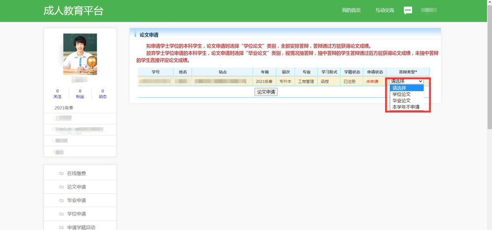 论文类型:本次论文类型分为“学位论文”和“毕业论文”。按照中文av 学籍管理规定,成人学历本科生申请学位的条件为:1、总平均绩点达到或超过1.82、无考试作弊行为;3、三年制本科补考课程不超过2门,五年制本科补考课程不超过3门;4、学位外语统考成绩合格。符合学位授予条件或拟申请学士学位的本科学生,在论文申请时请选择“学位论文”类别。放弃学士学位申请的本科学生,在论文申请时请选择“毕业论文”类别。