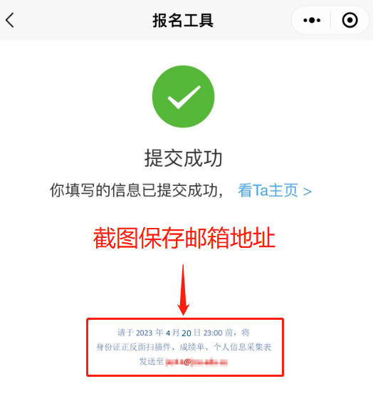 2.预报名成功后,于2023年4月20日23:00前,根据报名成功页面的指引(如图,截图保存),将“广东省高等教育自学考试成绩单”、“身份证正反面扫描件”、“附件:个人信息采集表(需填写)”发送至指定邮箱。请自行提前登录广东省自学考试管理系统打印成绩单,打印方式详见附件。逾期未发送视为放弃本次报考。
