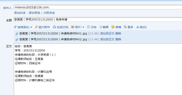 发送包含免修申请证明材料附件的邮件到:mianxiu2022#126.com(为防止爬虫,发邮件时请将#改为@)