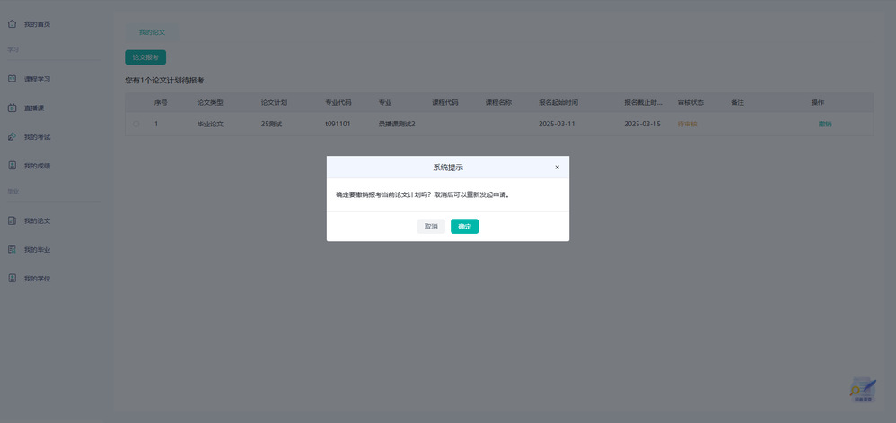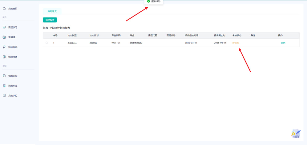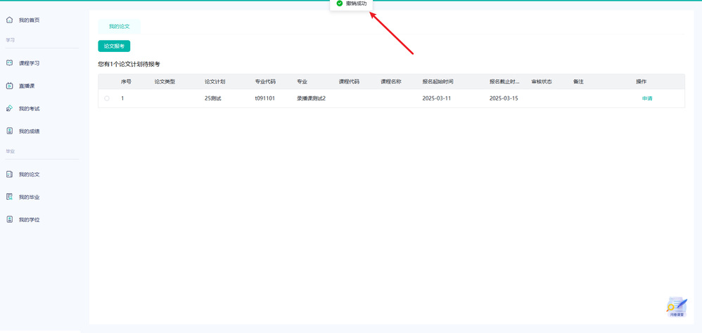 4、点击申请——申请成功。申请结束后由教务老师统一审核。
