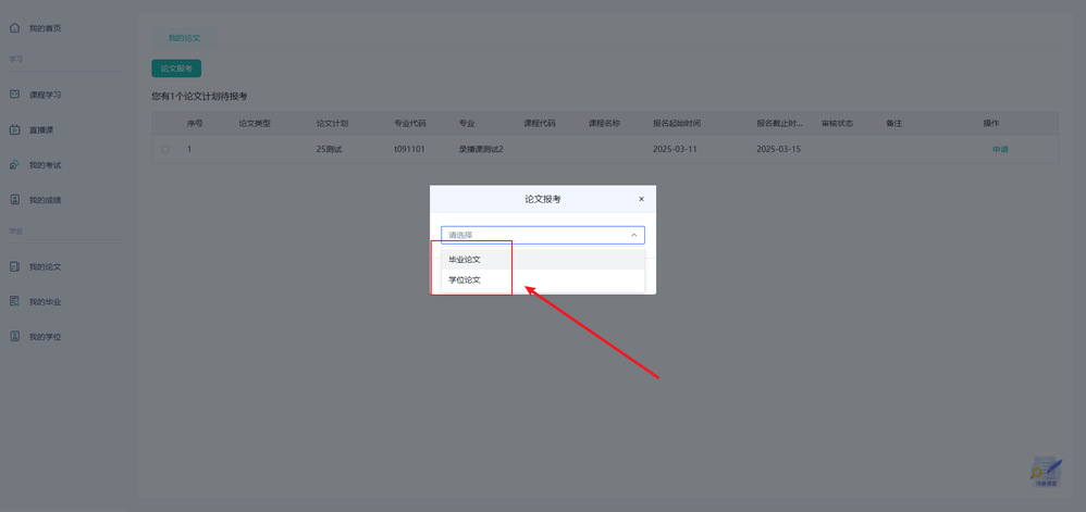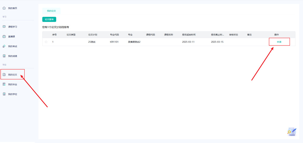 2、点击菜单中“我的论文”——操作点击“申请”。